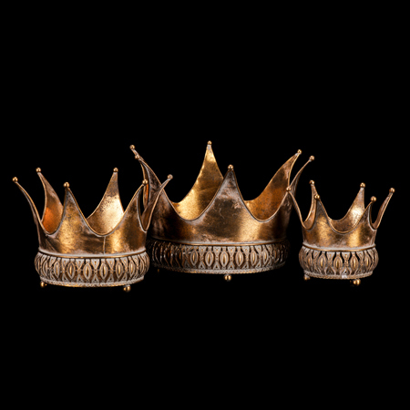 Kovový dekorační obal, v podobě zlatých korun v sadě 3 velikostí, vám přináší noblesu přímo na váš stůl. Právě kombinace zlaté barvy se starožitným vzhledem, povýší vaše běžné stolování na královskou úroveň. S tímto unikátním artiklem, který věrně připomíná cenný předmět s historickou hodnotou,...
