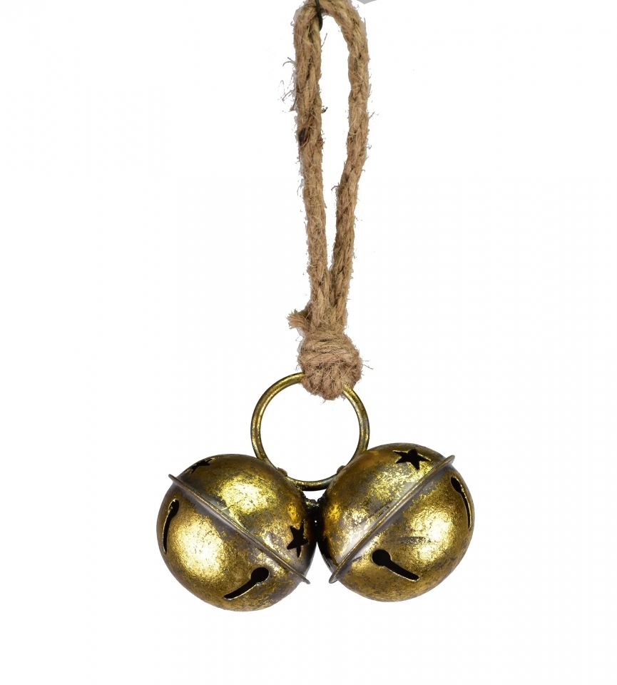 Dvojité kovové rolničky zlaté na jutovém provaze 5x11x20 cm
