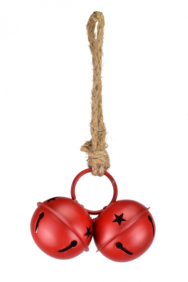 Dvojité kovové rolničky červené na jutovém provaze 5x11x20 cm