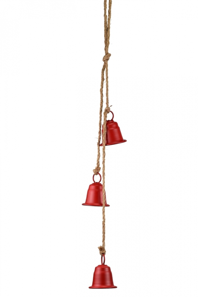 Tři červené kovové zvonky na jutovém provaze 7x5,8x63 cm