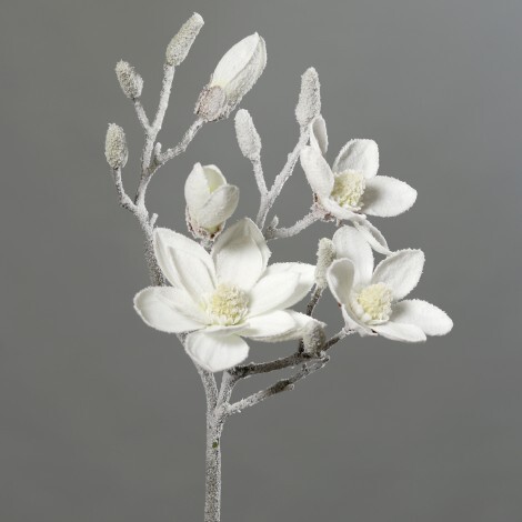 Magnolie větev velká zasněžená, v. 90 cm, 3 plné květy + 2 polorozvitá poupata + pupeny. Moc pěkné provedení prečítať celé