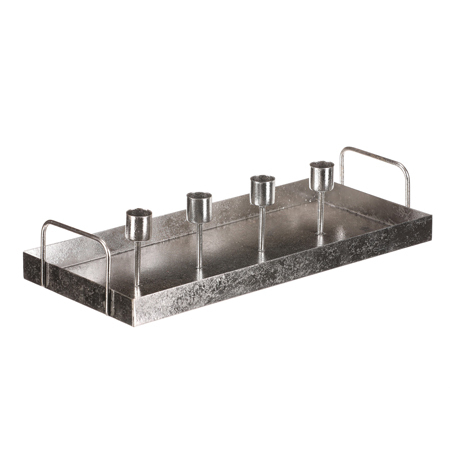 Elegantní kovový svícen v podobě obdélníkového tácu se dvěma uchy, na kterém najdeme držáky pro 4 kónické svíčky, zajišťuje vyvážený design a estetický vzhled. Tento stříbrný svícen je ideální pro vánoční a adventní výzdobu, ať už ho použijete samotný nebo ho ozdobíte dalšími dekorativními prvky....