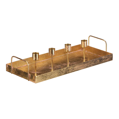Elegantní kovový svícen v podobě obdélníkového tácu se dvěma uchy, na kterém najdeme držáky pro 4 kónické svíčky, zajišťuje vyvážený design a estetický vzhled. Tento zlatý svícen je ideální pro vánoční a adventní výzdobu, ať už ho použijete samotný nebo ho ozdobíte dalšími dekorativními prvky.... prečítať celé