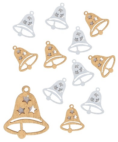 Zvonek dřevěný s lepíkem 3 cm,zlatý a stříbrný,12 ks
