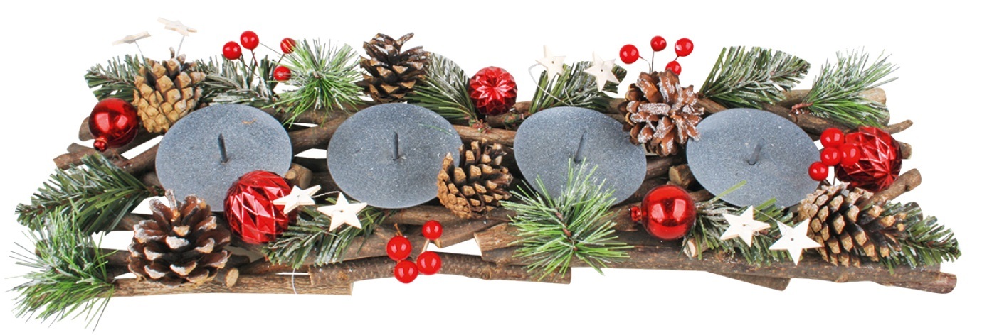 Dřevěný svícen na 4 svíčky s červenými doplňky 51 cm