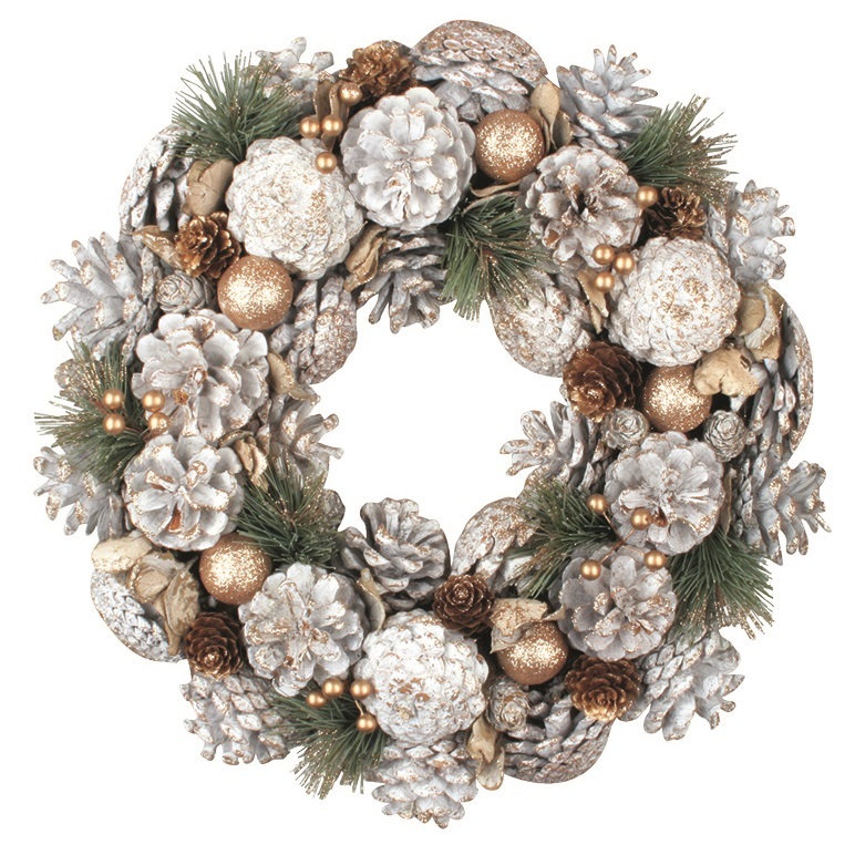 Věnec z šišek a jehličí se zlatými dekoracemi 34 cm
