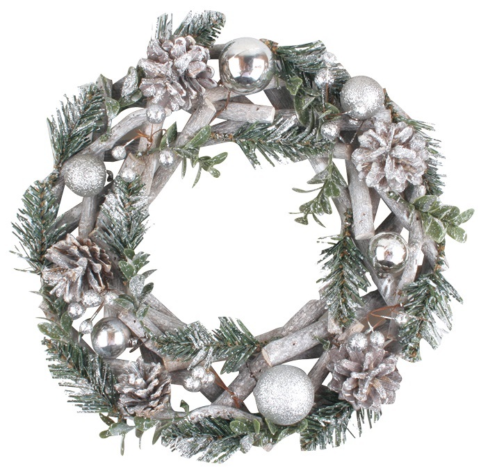 Dřevěný věnec s šiškami a stříbrnými doplňky 30 cm