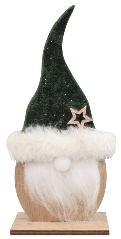 Dřevěná dekorace skřítek s tmavě zelenou čepicí a svítícím nosem LED 19 cm
