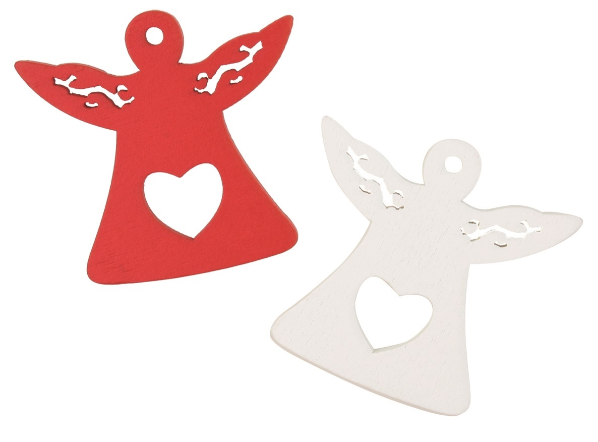 Anděl dřevěný s lepíkem 4,5 cm, červený a bílý, 16 ks v krabičce