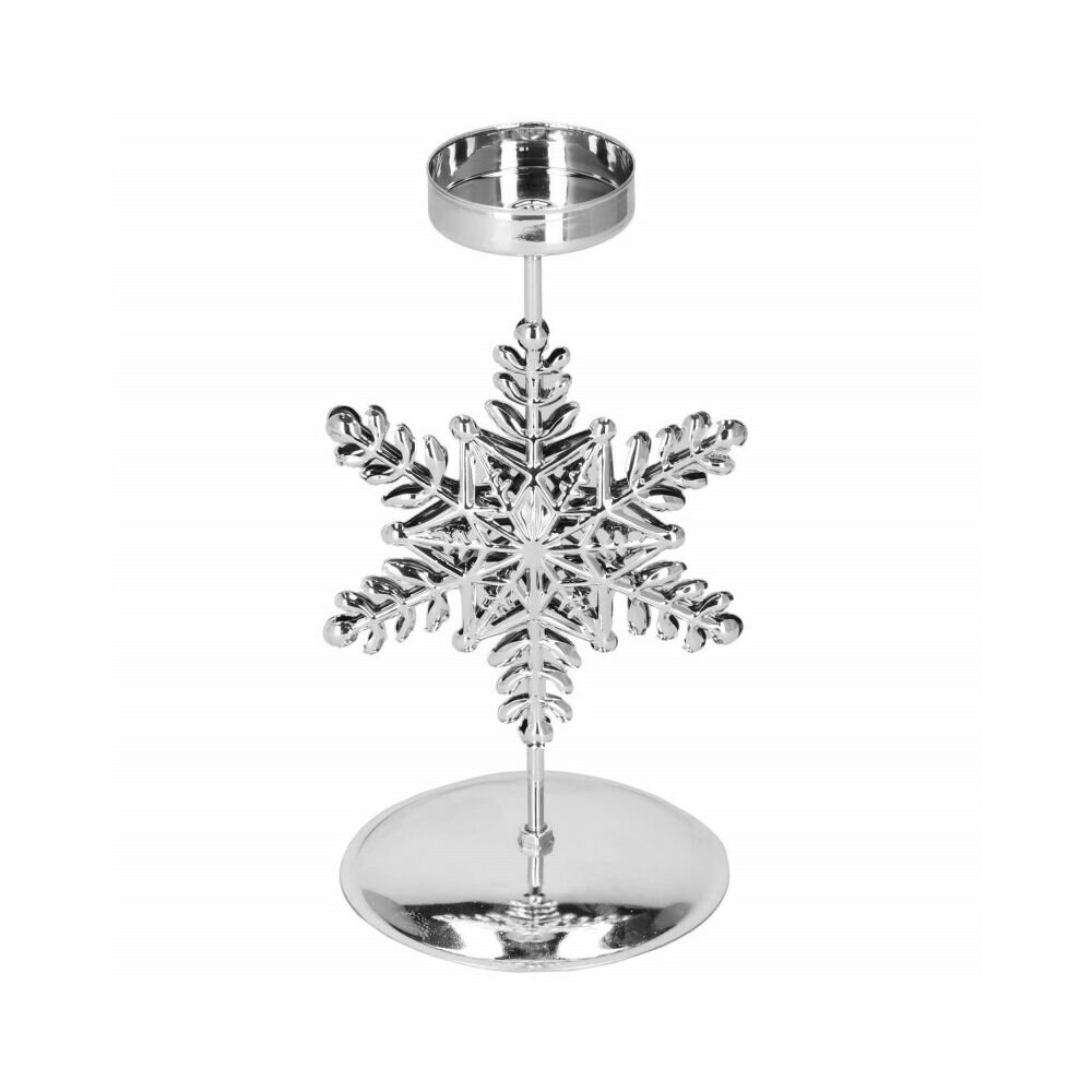 Elegantní kovový svícen na čajovou svíčku. Zvýšený podstavec dokorativně zdoben sněhovou vločkou. Perfektní pro období Vánoc a adventu. Výška 17 cm, šířka 9 cm, průměr otvoru na svíčku 4 cm.