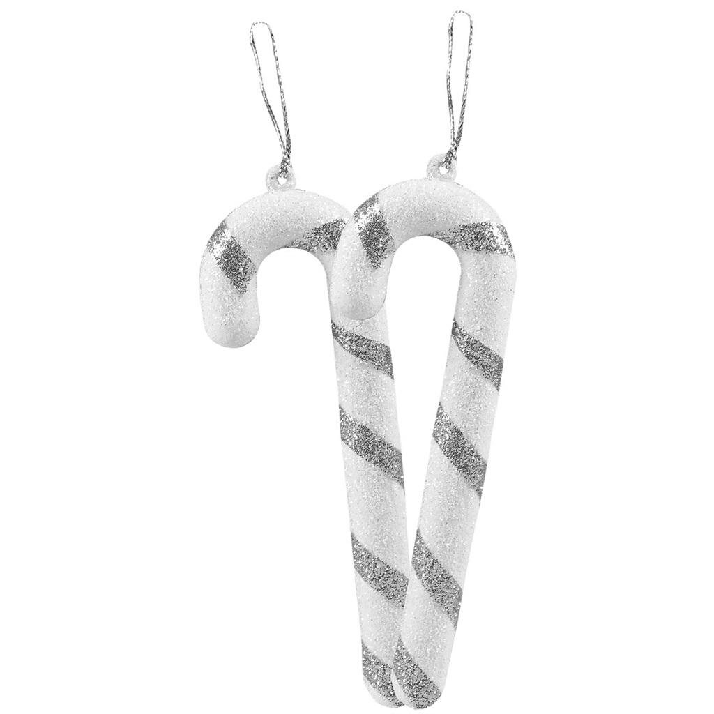 Brokatowa dekoracja świąteczna w kształcie laski cukrowej w kolorze białym ze srebrnym pasem. Wykonana z tworzywa sztucznego, wyposażona w sznurek umożliwiający jej zawieszenie. W opakowaniu znajdują się 2 sztuki. Produkt o wymiarze 12 cm. prečítať celé