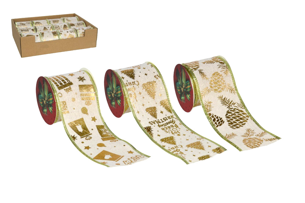 Luxusní dekorační stuhy ve zlaté barvě s vánočními motivy, ideální pro dotvoření sváteční atmosféry. Každá stuha má délku 270 cm a je dostupná ve třech elegantních designech, které dokonale doplní vánoční výzdobu, dárkové balení nebo jiné slavnostní dekorace. Díky kvalitnímu materiálu jsou stuhy odolné a dobře drží tvar, což usnadňuje jejich použití při zdobení stromků, věnců nebo interiérových dekorací. Cena je uvedena za 1ks. Celé balení obsahuje12ks.