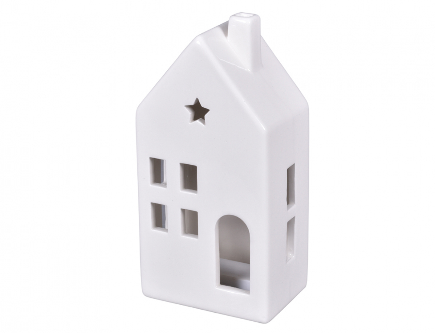 LED dekorace v podobě domečku, vhodný pro období Vánoc a zimy. Obsahuje led svítidlo, po zapnutí vytváří milý dojem, že se v domečku svítí. Působí velmi útulně, svým neutrálním designem se hodí do každého interiéru. Materiál: glazovaná keramika. Vhodný do interiéru. Rozměry: délka 9 cm, hloubka 6 cm, výška 18 cm. Barva: bílá.