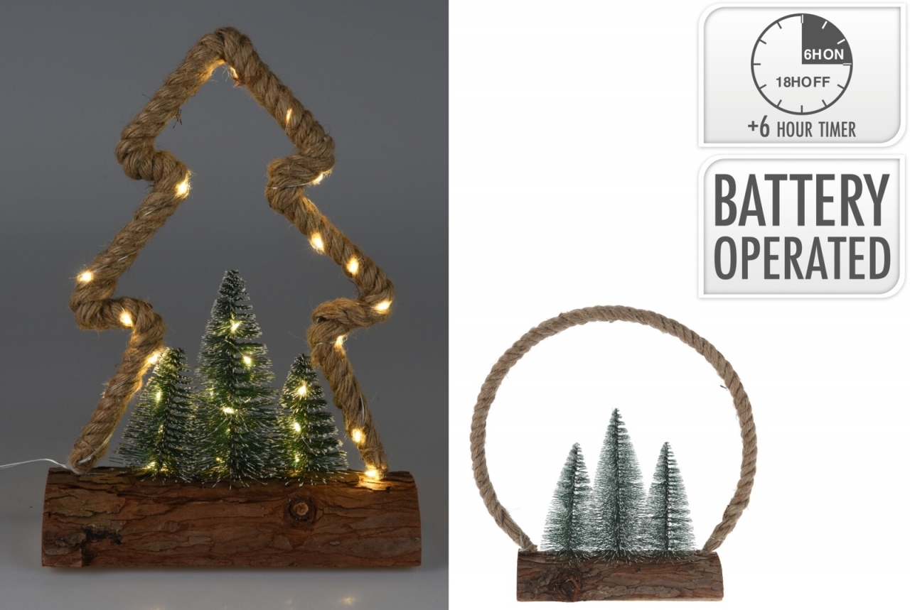 Jutový kruh s LED diodami na dřevěné podložce. Uvnitř jutového kruhu jsou menší plastové stromečky s LED diodami. Celkově 30 LED diod teplé bílé barvy. Napájení 3x AA tužkovými bateriemi (nejsou součástí výrobku). Součástí je časovač 6/18h. Délka přívodového kabelu 30 cm.