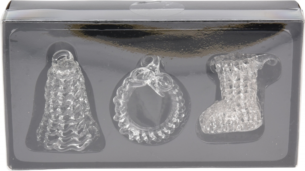 Skleněná závěsná dekorace sada 3 ks. V sadě je 1x zvonek, 1x věnec, 1x bota.Materiál: skloRozměry:cca 8x8x8 cm prečítať celé
