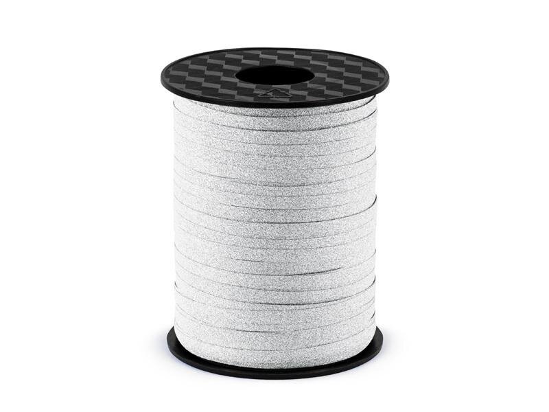Wstążka plastikowa brokatowa w kolorze srebrnym, szerokość ok. 5 mm, długość ok. 225 m. prečítať celé