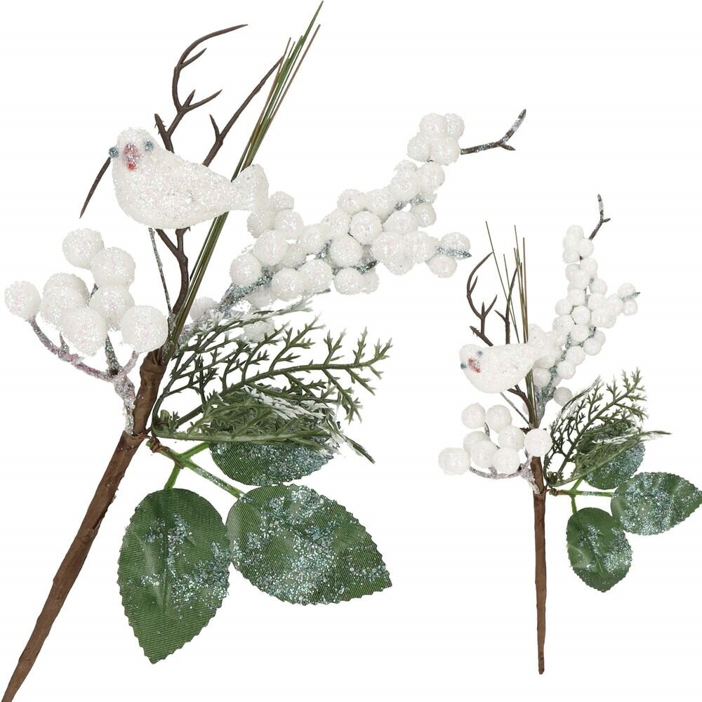 Bohatě zdobená větvička s bobulemi bílých jeřabin se třpytkami a ptáčkem. Efekt námrazy, zúžený konec pro snadné zapíchnutí. Výška 25,5 cm, šířka 7,5 cm. Překrásná vánoční dekorace, která může být použita samostatně nebo jako prvek větších aranžmá. Vhodné pro vnitřní i venkovní použití.