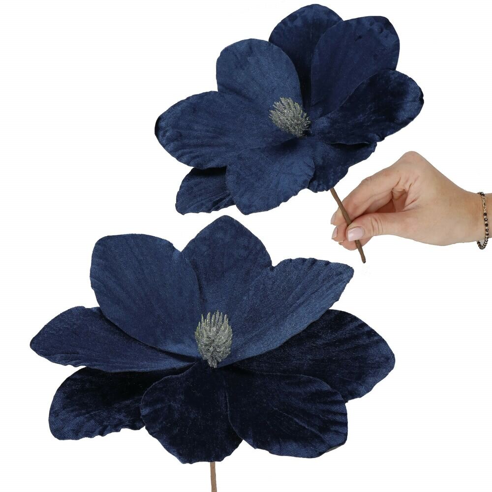 Umělý květ magnolie se sametovými okvětními lístky se stříbrným pupenem. Realistické zpracování, ohebný stonek. Vhodné do různých vánočních aranžmá, k výzdobě stromečku nebo jako samostatná dekorace. Velikost 23x30 cm, modrá barva. prečítať celé