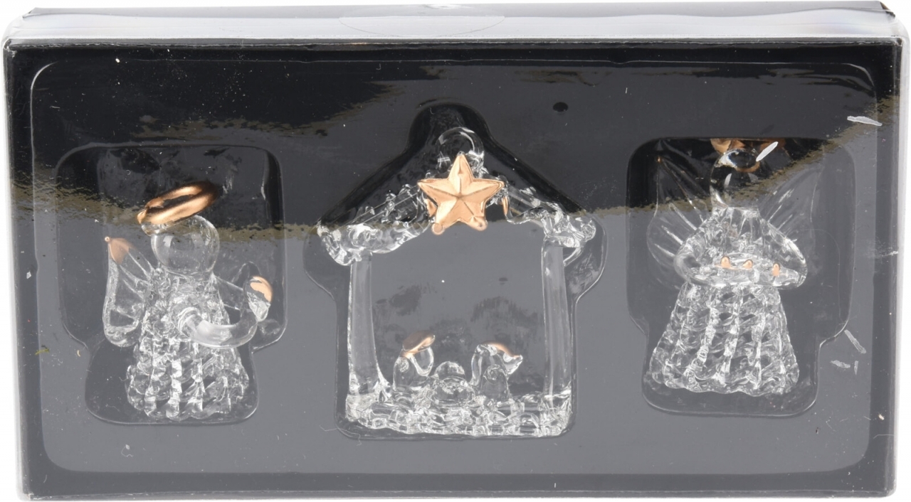 Skleněná závěsná dekorace sada 3 ks. V sadě je 2x anděl a 1x betlém.Materiál: skloRozměry:cca 8x8x8 cm prečítať celé