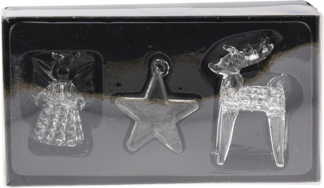 Skleněná závěsná dekorace sada 3 ks. V sadě je 1x anděl, 1x hvězda a 1x sob.Materiál: skloRozměry:cca 8x8x8 cm prečítať celé