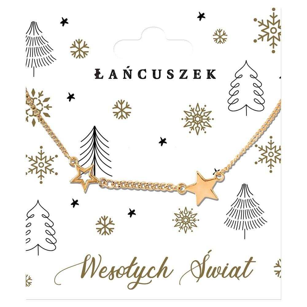 Świąteczny łańcuszek z gwiazdkami Złoty łańcuszek z dwiema gwiazdkami, idealny na Mikołajki lub jako dodatek do świątecznego prezentu. Wykonany z wysokiej jakości stopu cynku i metalu. Zapakowany na ozdobnej podkładce z napisem Wesołych Świąt. Specyfikacja: Design: dwie gwiazdki Materiał: stop...