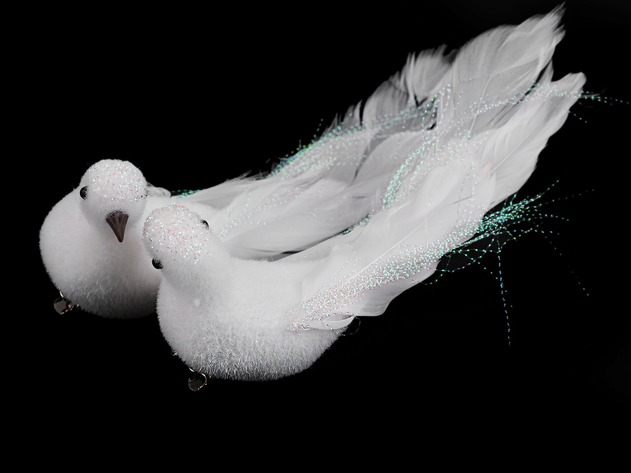 Pár dekoračních holubic zdobí působivá peříčka a třpytivé glitry s AB efektem. Hlavy mají otočené směrem k sobě. Zespodu mají připevněnou kovovou sponu, díky které je můžete připevnit například na věnec, větvičku, záclonu či je naaranžovat do květinových vazeb. prečítať celé