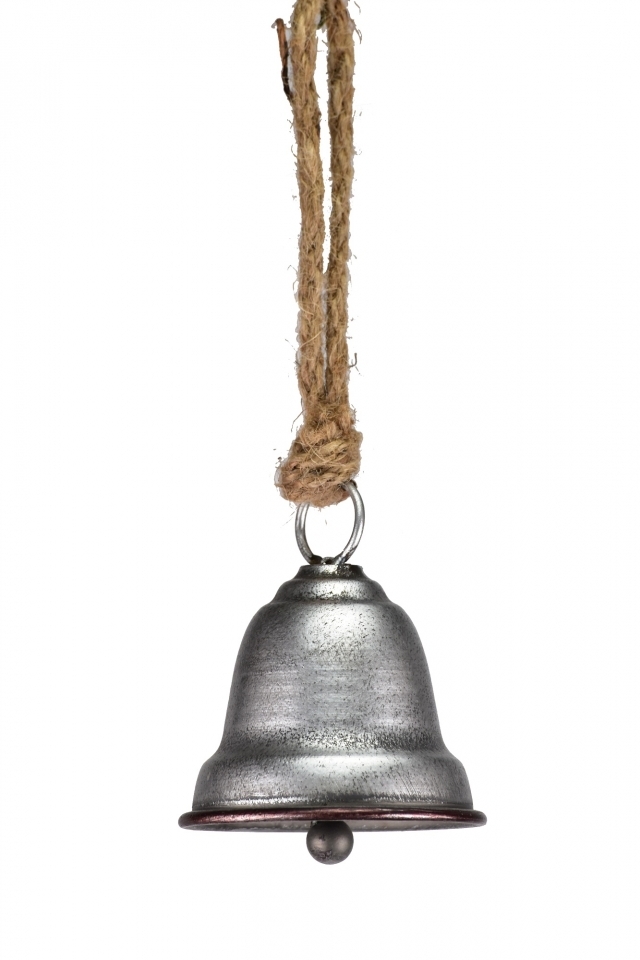 Kovový zvonek stříbrný na jutovém provaze 9x7,7x25 cm