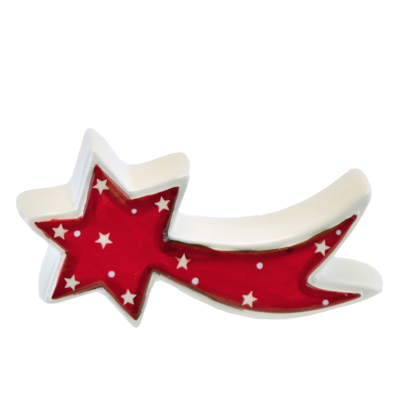 Kometa červená s hvězdičkami 8x15 cmVýška: 8 cmŠířka: 3,5 cmDélka: 15 cmMateriál: KeramikaBarva: Červeno-bíláTyp: SoškaDekorace: VánočníLesklý povrch: Ano prečítať celé