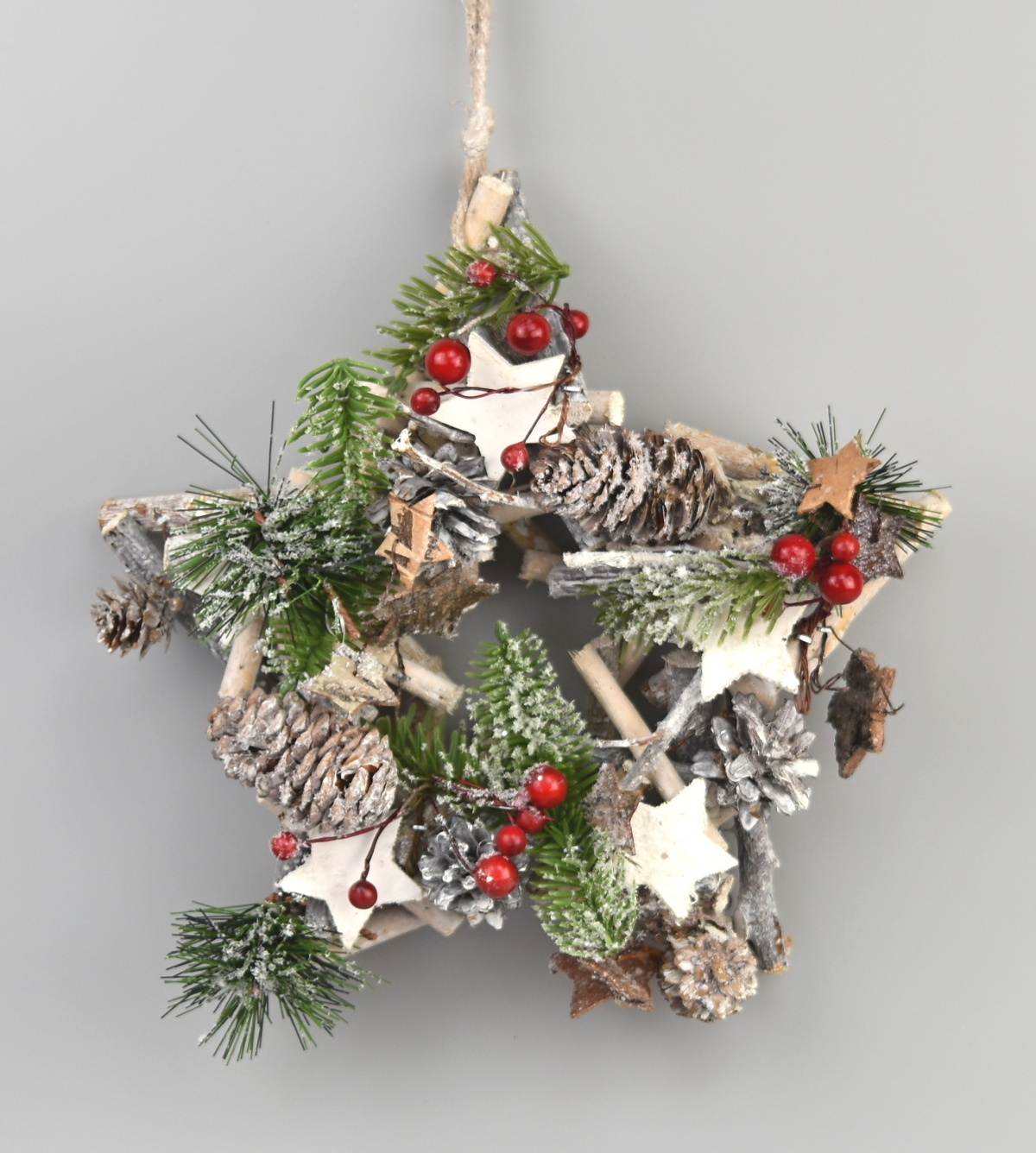 Hvězda závěsná z dřívek a proutí, doplněný šiškami, bezinky,hvězdičkami a zasněženým chvojím. prečítať celé