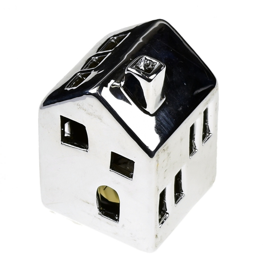Keramický domeček stříbrný s LED osvětlením. Baterie je součástí výrobku.Výška 9,7 cm, šířka 6 cm. prečítať celé