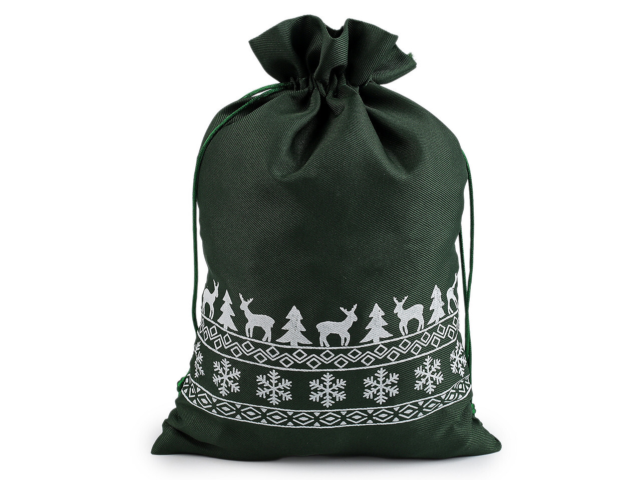 Vánoční dárkový pytlík je z obou stran ozdobený potiskem sobů, stromečků a vloček. Můžete ho použít na dárky nebo ho naplnit mikulášskou nadílkou, ušetří vám čas při balení. Dá se naaranžovat i jako vánoční dekorace. Stahuje se pomocí kulatých saténových šňůrek, dárku dodá osobní kouzlo a půvab. prečítať celé