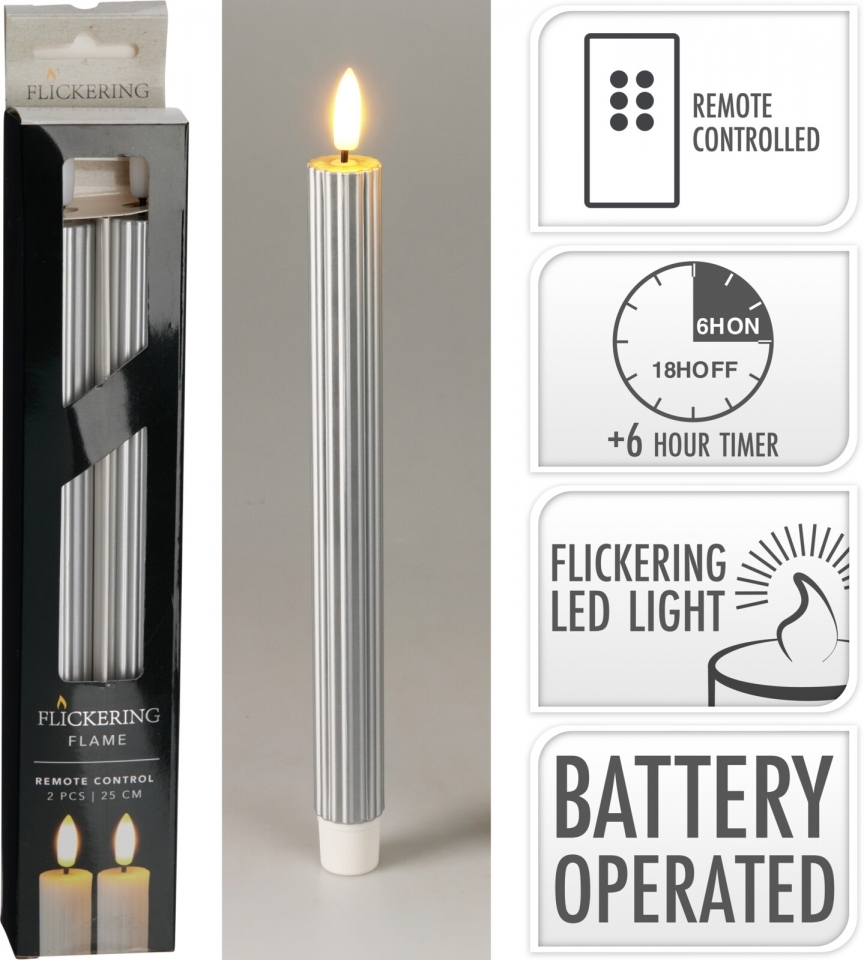 LED svíčky vysoké stříbrné s vroubkováním - sada 2ksmateriál: PSbarva: stříbrnározměr: 25 x 2 cm2 x AAA baterie na 1 svíčku - nejsou součástí1X baterie CR2025 je součástí dálkového ovladačdálkový ovladač se 3 tlačítky (ZAP./VYP./ČASOVAČ)Blikající plamen. prečítať celé