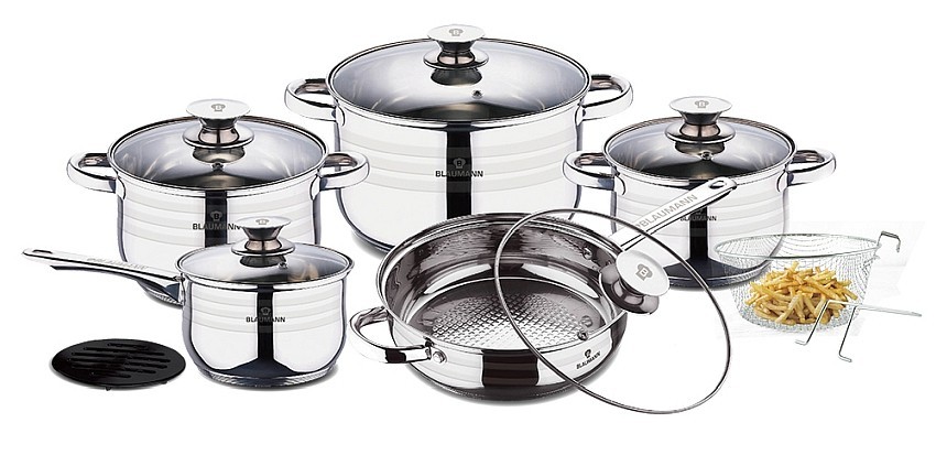 materiál: nerezová ocelsada 12 ks obsahuje: kastroly s poklicí 24 x 14,5 cm, 20 x 12,5 cm, 18 x 11,5 cmrendlík s poklicí 16 x 10,5 cmpánev 24 x 7,5 cmfritovací košík s rukojetí5ti vrstvé dno nýtované rukojeti pro bezpečné používání vhodné na všechny typy sporáků včetně indukčních vhodné do...