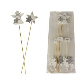 Sada dekoračních zápichů. Sada obsahuje 4 zápichy. Rozměry : 7 - 8 x 0,4 cm, výška 8 cm, celková výška zápichu 34 cm. Barva : kombinace bílá se stříbrnou. Materiál na bázi dřeva. prečítať celé