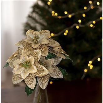 Dekorační umělá kytice. Rozměry : 22 x 15 cm, celková délka dekorace 33 cm. Barva : kombinace zlatá se zelenou. Materiál : plast. prečítať celé