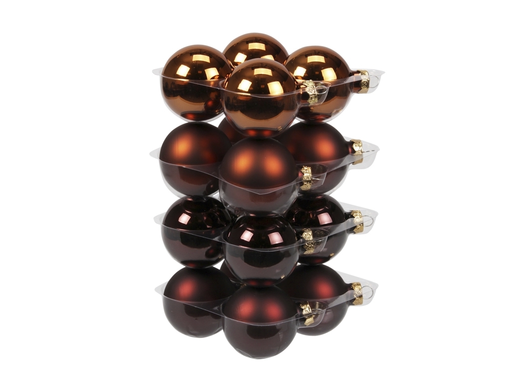 Sada 16 ks skleněných baněk v barvě tmavě hnědé. V sadě jsou namíchané lesklé a matné baňky.Materiál: skloRozměr:průměr 5,7 cm prečítať celé