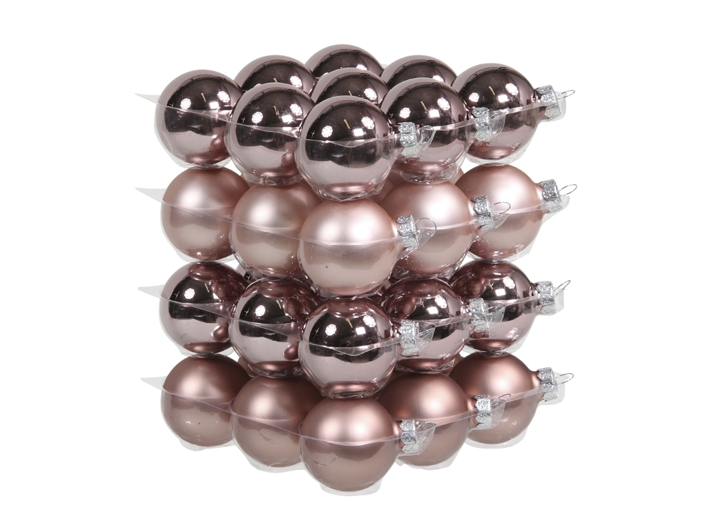 Sada 36 ks skleněných baněk růžové-kouřové barvy. V sadě jsou namíchané matné a lesklé baňky.Materiál: skloRozměr:průměr 4 cm prečítať celé