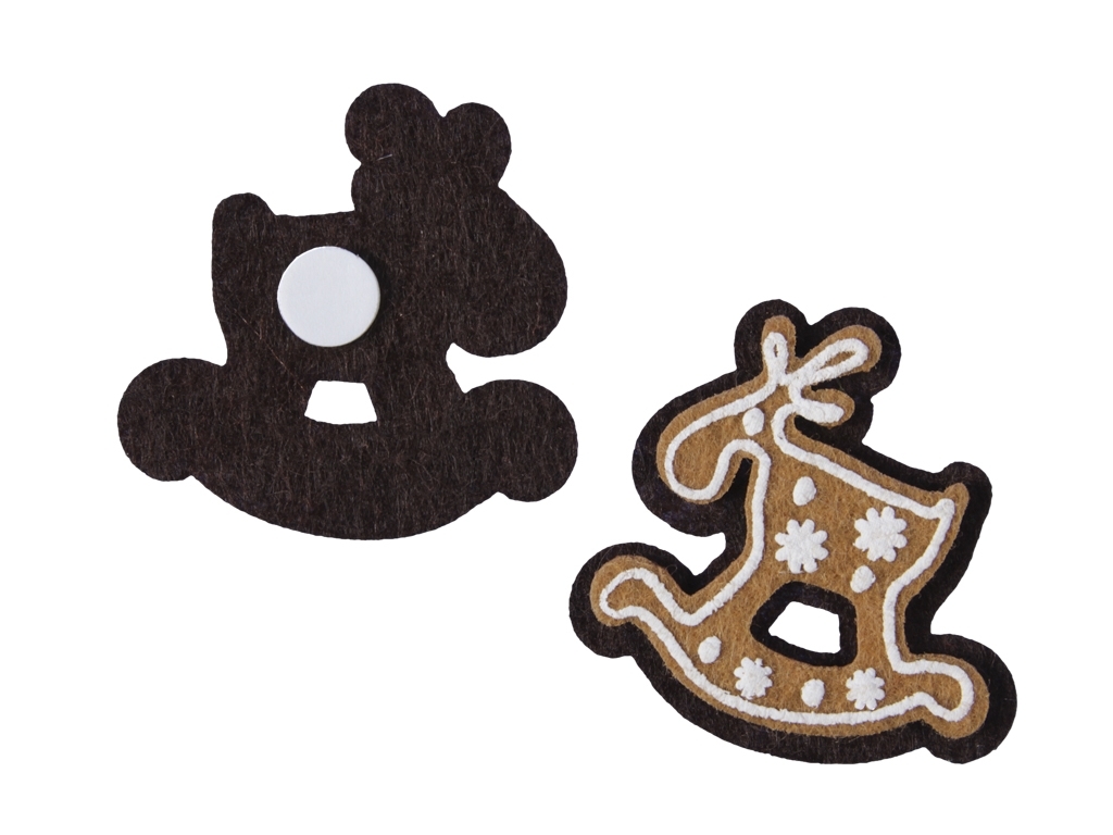 Dekorativní plstěný - filcový sob s lepkou na zadní straně. Sob svým provedením připomíná perníkovou pochoutku. Sada 12 ks.Materiál: plsťRozměry:4,5x4,5 cm prečítať celé
