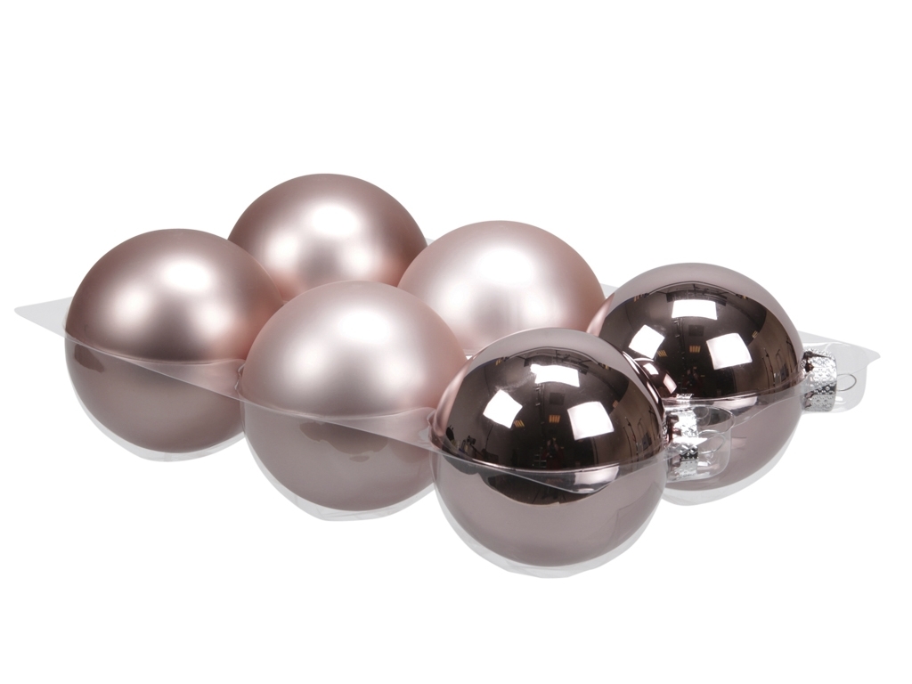 Sada 6 ks skleněných baněk růžové-kouřové barvy. V sadě jsou namíchané matné a lesklé baňky.Materiál: skloRozměr:průměr 8 cm prečítať celé