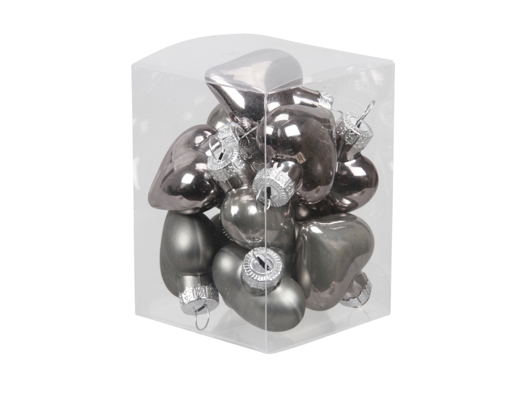 Sada 12 ks skleněných šedých baněk - srdíček. Baňky jsou tmavě šedé, světle šedé a matné.Materiál: skloRozměr:4 cm prečítať celé