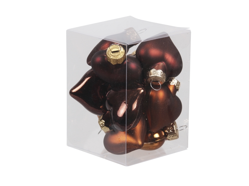 Sada 12 ks skleněných baněk - srdíček v barvě tmavě hnědé. V sadě jsou namíchané lesklé a matné baňky.Materiál: skloRozměr: 4 cm prečítať celé