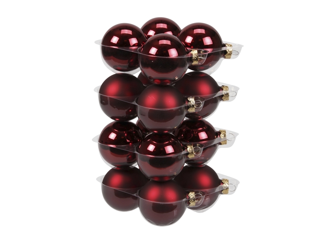 Sada 16 ks skleněných baněk v barvě tmavě červené. V sadě jsou namíchané lesklé a matné baňky.Materiál: skloRozměr:průměr 5,7 cm prečítať celé