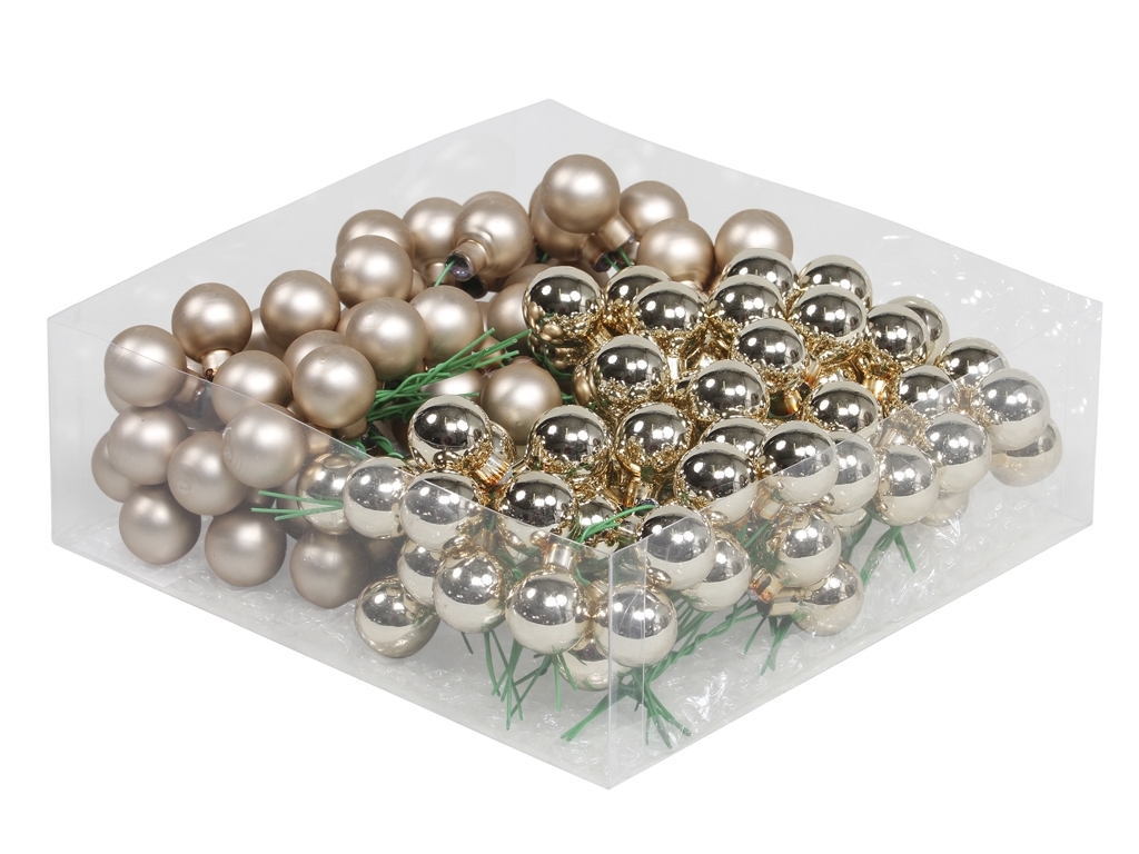 Sada 144 ks skleněných baněk s drátkem v barvě autumn blonde. V sadě jsou namíchané lesklé a matné baňky.Materiál: skloRozměr:průměr 2 cm prečítať celé
