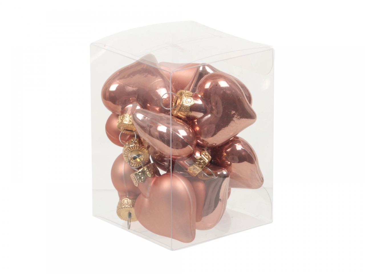 Sada 12 ks skleněných baněk - srdíček v barvě coral. V sadě jsou namíchané lesklé a matné baňky.Materiál: skloRozměr:4 cm prečítať celé