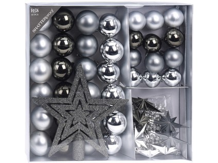 Pripravte svoj domov na sviatočné obdobie s touto sadou 45 vianočných ozdôb, ktorá zahŕňa gule, špičku a ďalšie dekorácie v elegantných odtieňoch striedavo striebornej a antracitovej. Tieto ozdoby vám umožnia vytvoriť harmonický a štýlový vianočný stromček alebo výzdobu, ktorá zaujme každého návštevníka.