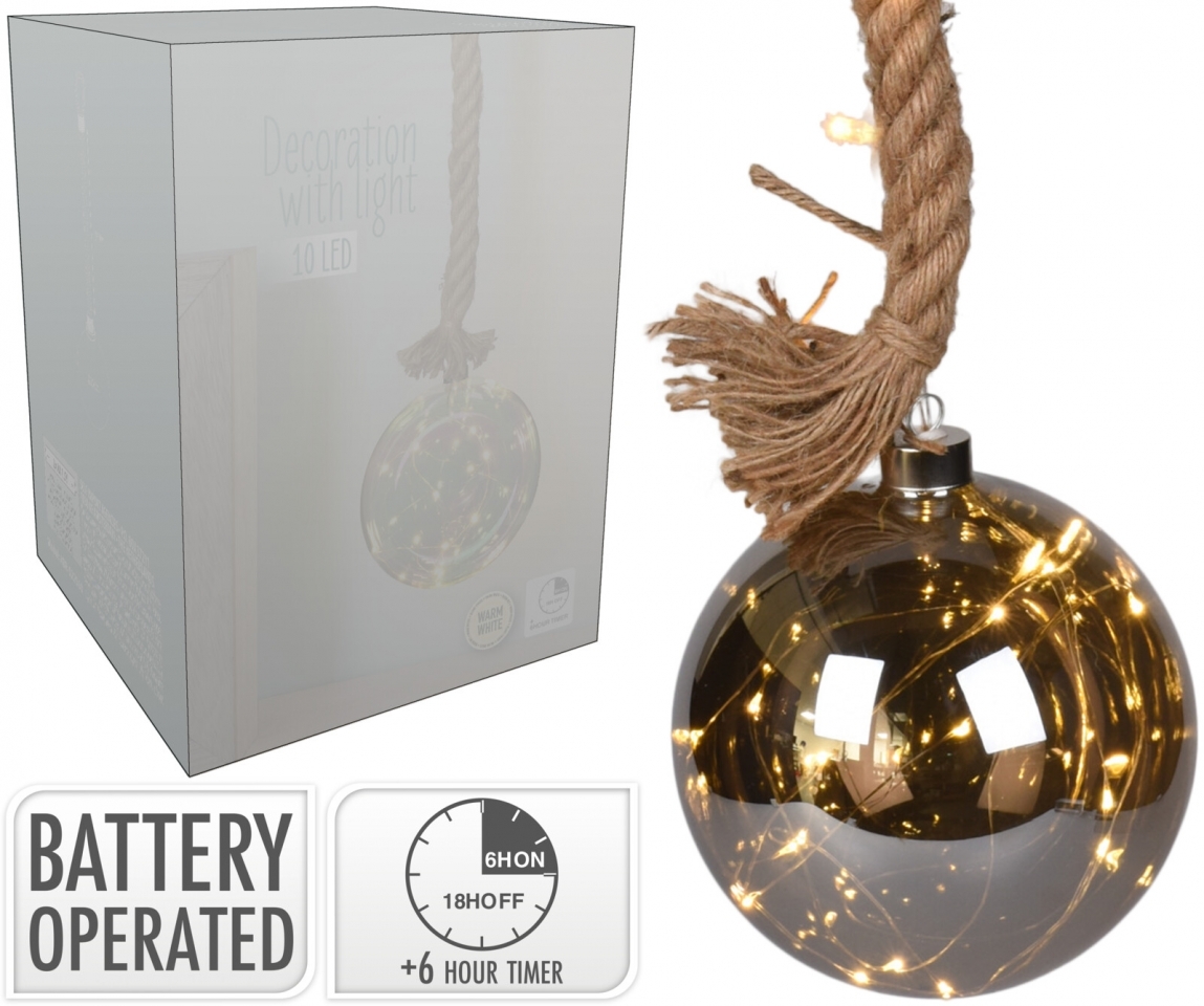 Dekorativní skleněná LED koule zavěšená na laně s LED diodami. Kouli můžete zavěsit kam se vám zlíbí. V baňce je 10 LED diod s funkcí časovače (6 hodin svítí a 18 hodin nesvítí) a na laně 9 LED diod. Napájení na 2x AA baterie (nejsou součástí výrobku). Pouze pro vnitřní použití.