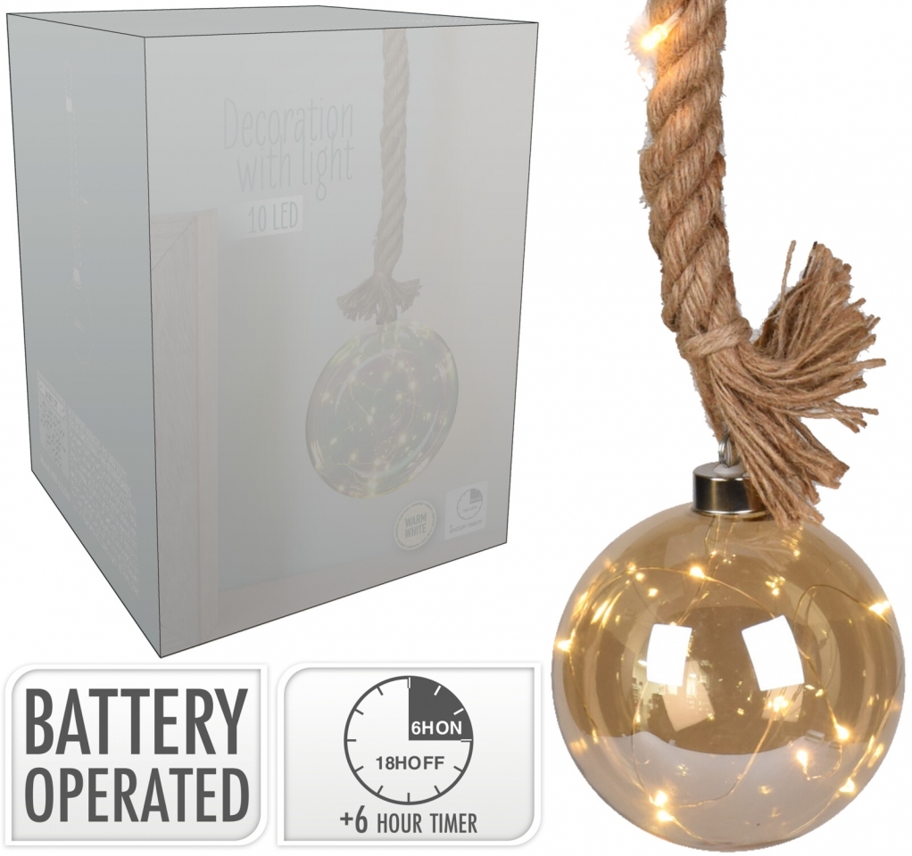 Dekorativní skleněná LED koule zavěšená na laně s LED diodami. Kouli můžete zavěsit kam se vám zlíbí. V baňce je 10 LED diod s funkcí časovače (6 hodin svítí a 18 hodin nesvítí) a na laně 9 LED diod. Napájení na 2x AA baterie (nejsou součástí výrobku). Pouze pro vnitřní použití.