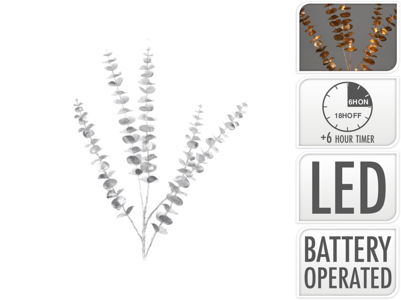 Umělá větvička eukalyptu s 16 teplými bílými LED diodami a časovačem 6/18 h. Napájení 2x AA bateriemi (nejsou součástí výrobku).Materiál: plast, kovRozměry:délka 66 cm prečítať celé
