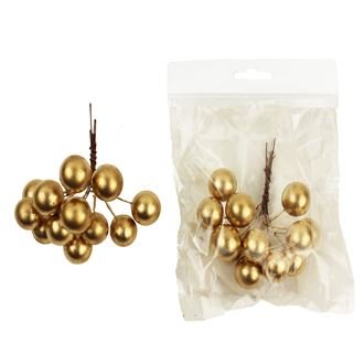 Sada přízdob ve svazcích.Přízdoby jsou na drátě, bobule mají průměr 1,5 cm, výška zápichu 7 cm.Sáček obsahuje 2 svazky, 24 ks. Barva : zlatá.Materiál : plast. prečítať celé