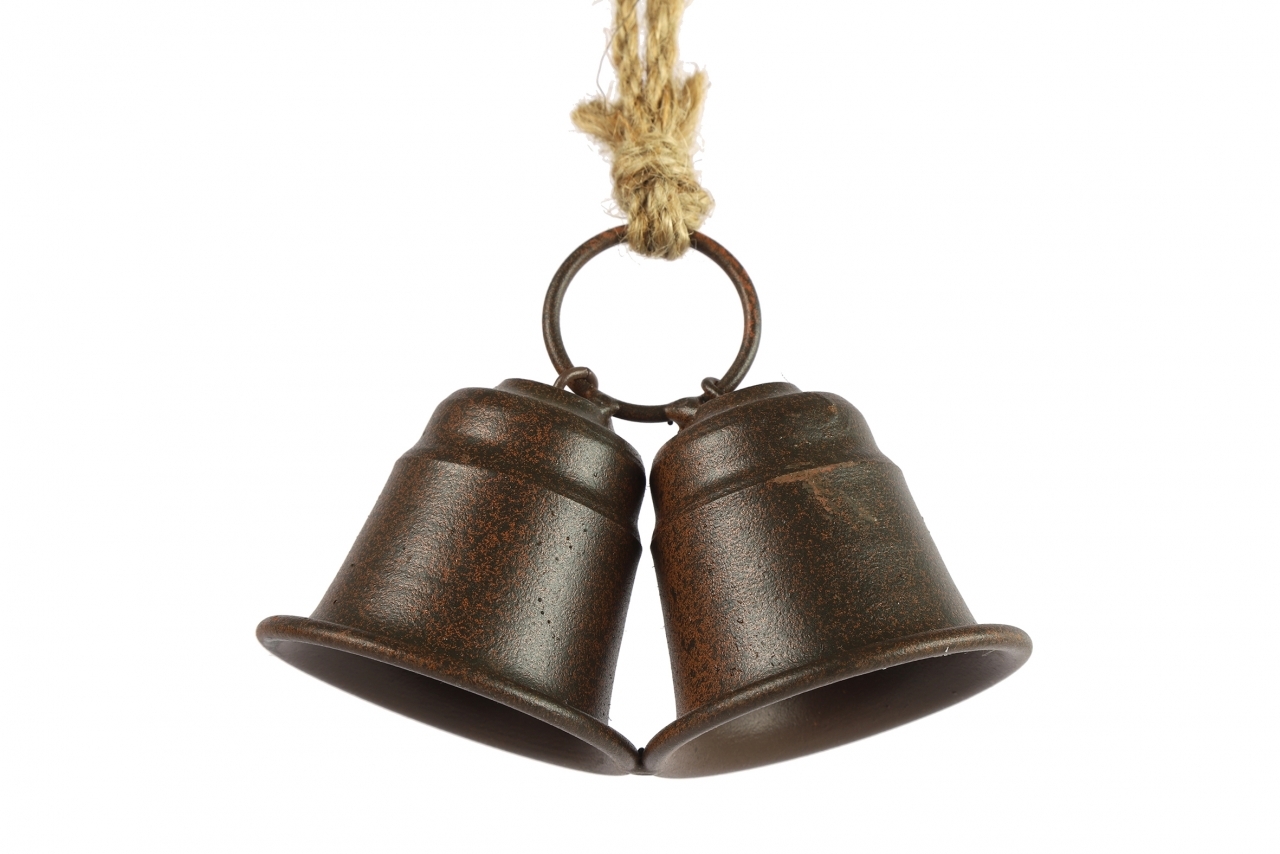 Spojené kovové zvonečky na jutovém provaze.Materiál: kov, jutaRozměry:délka celkem 21,5 cmzvonky 8,5x12x6 cm prečítať celé